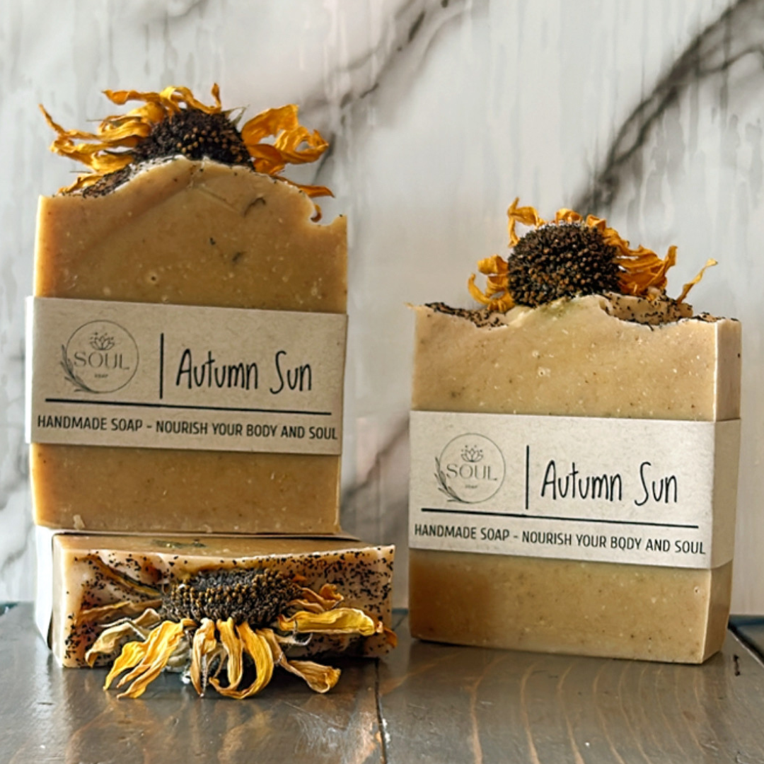 A warm and radiant bar inspired by the glow of autumn sunlight. Autumn Sun Soap nourishes and rejuvenates the skin while uplifting the spirit, leaving you feeling energized, refreshed, and balanced. Its bright, citrusy, and minty aroma awakens the senses and promotes vitality and clarity, while turmeric and brown eyed susans gently soothe, brighten, and nourish the skin for a healthy, radiant glow.