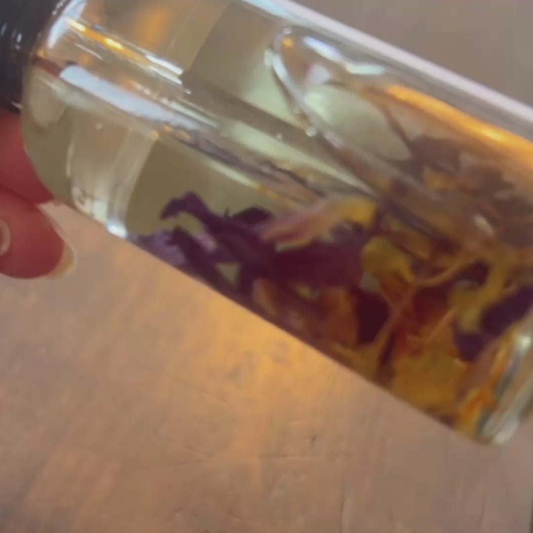 A sacred infusion of organic Thai Blue Lotus flowers steeped into nourishing sweet almond oil, softly scented with frankincense and ylang ylang, and finished with delicate Blue Lotus petals. A mystical botanical blend that nourishes the skin while opening pathways to intuition, stillness, and the divine.